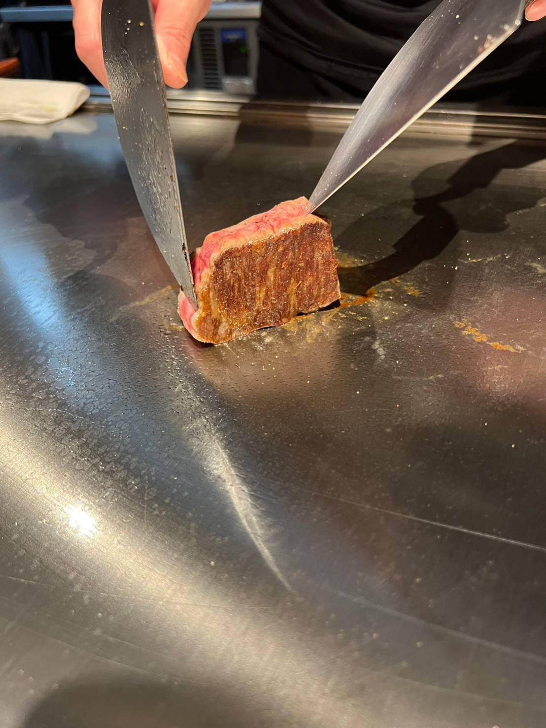 表面は肉汁を閉じ込めるイメージでがっちり焼き固めてから、肉を軽く休ませ、肉汁が落ち着いてからかっとしていくと良い。